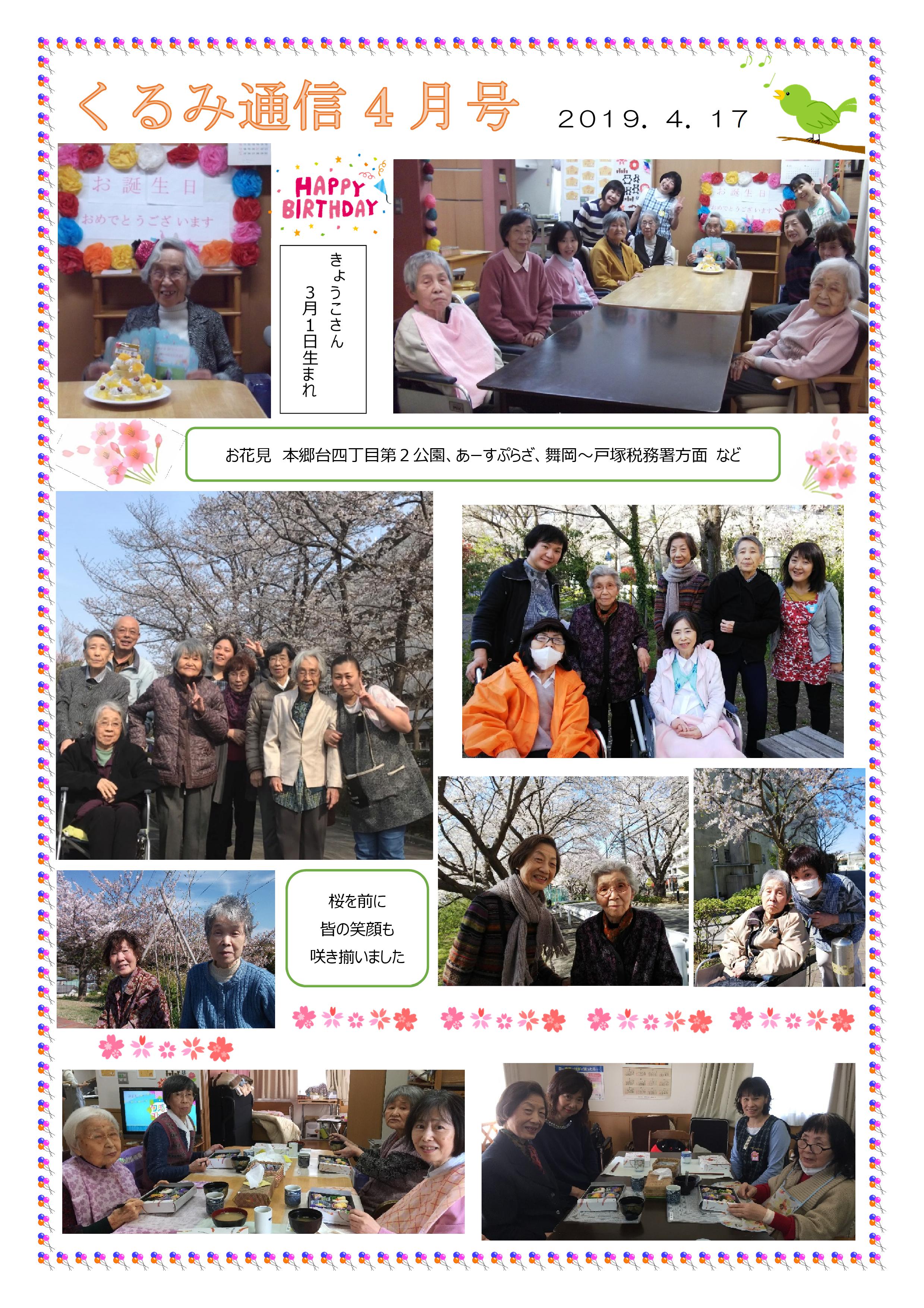 | 2019年4月20日土曜日、同じ「地域サポート虹」グループのグループホームに入所されました元くるみのご利用者様が旦那様と来所くださいました。早いものでグループホームに入所され、3年がたちました、かわらずお元気な様子がみられ良かったです。後藤由紀子 |